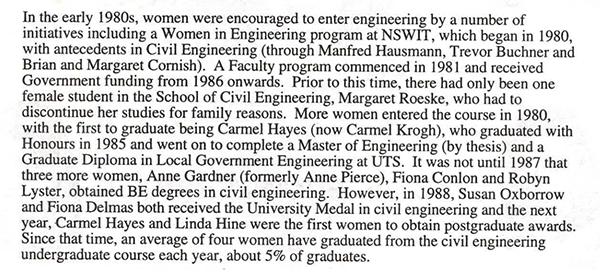 My early days as a trainee engineer at the waterboard in construction was certainly a revelation to me and to the construction crews who had never had a female on the job before. I spent 2 years in that district, doing a lot of surveying for sewering some areas of Campbelltown. I can honestly say that they were some of the best years of my life - the construction crews looked after me – once they realised that I had a sense of humour and was willing to stick up for myself, and that I didn’t get offended at swearing.