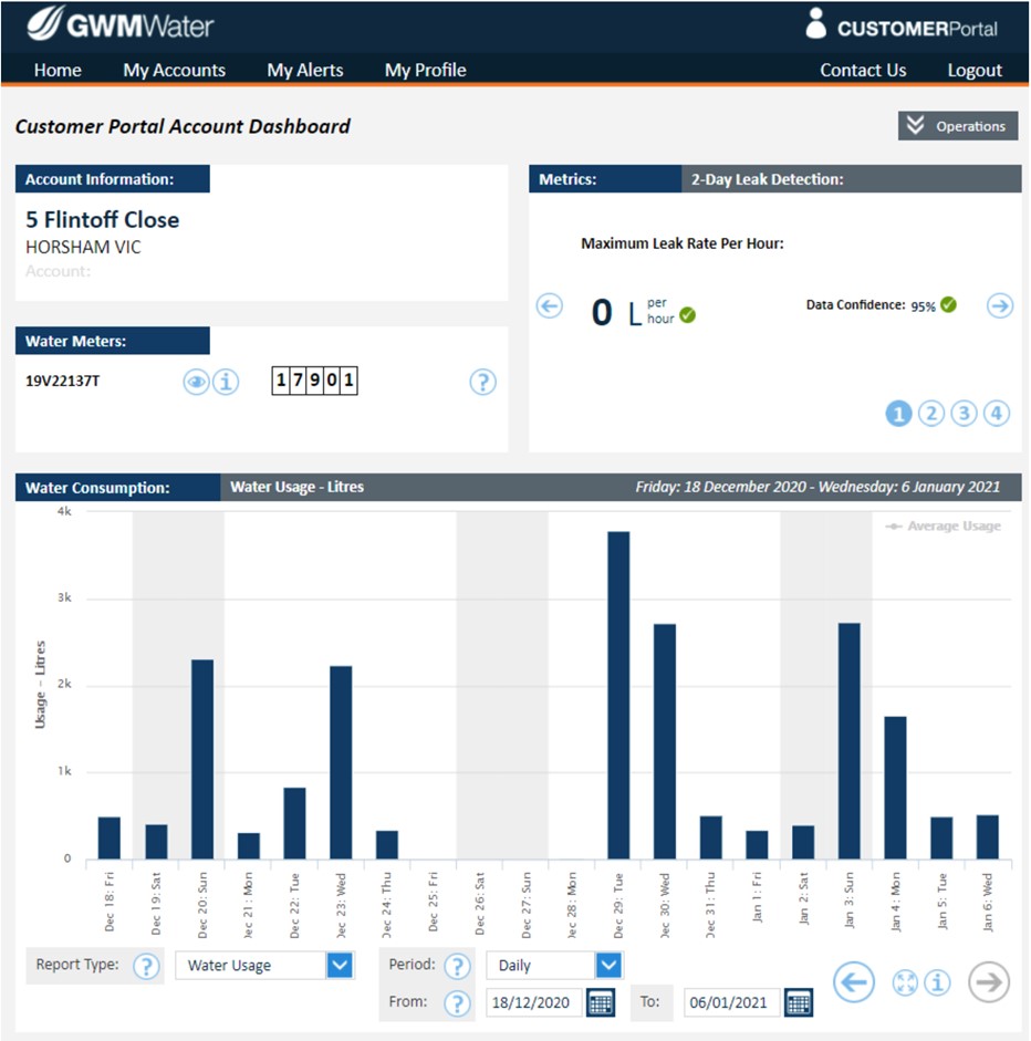 The digital meters record consumption at regular intervals and transmit data at user defined frequencies (presently hourly) using a Low Power Wide Area Network (LPWAN). The consumption data is aggregated by the contractor and returned to GWMWater for operational purposes to support water use across the day and trending over longer timeframes. A census of the data is used to produce the monthly/quarterly bill, eliminating the need for manual meter reads. Consumption data is re-directed into the Customer Portal, empowering the customer with more information about their water service than ever before.