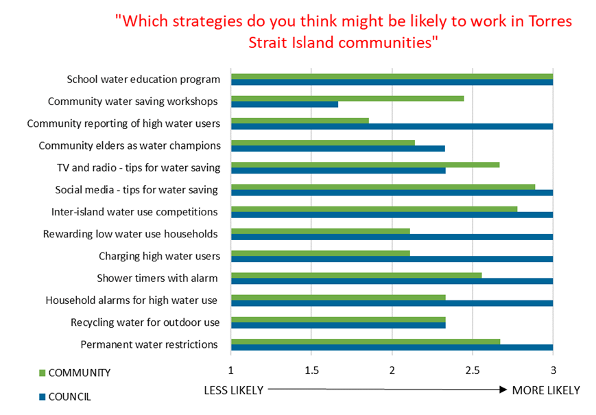 The idea of engaging community Elders and Traditional Owners to take on a “water champion” role in the community, at the exclusion of TSIRC involvement, was not viewed favourably, as this role was seen firmly as council’s responsibility. However, many participants agreed that sharing water stories with friends and family, and even as a school activity, as part of a Waterwise program, was an appropriate and effective way for the Elders to draw on Indigenous culture and knowledge transfer some of their stories of accessing and saving water to highlight the strengths of traditional water literacy in the community.