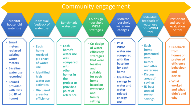 Based on participant and local council feedback, five ‘tools’ or strategies were developed to trial (Table 1). The key steps of the community-based water demand management (CWDM) trial are shown in Figure 2. These included: 1) smart meter enabled baseline water use characterisation; 2) individual feedback of water use (Figure 3); and 3) co-designing CWDM strategies with participants and council (Figure 4).