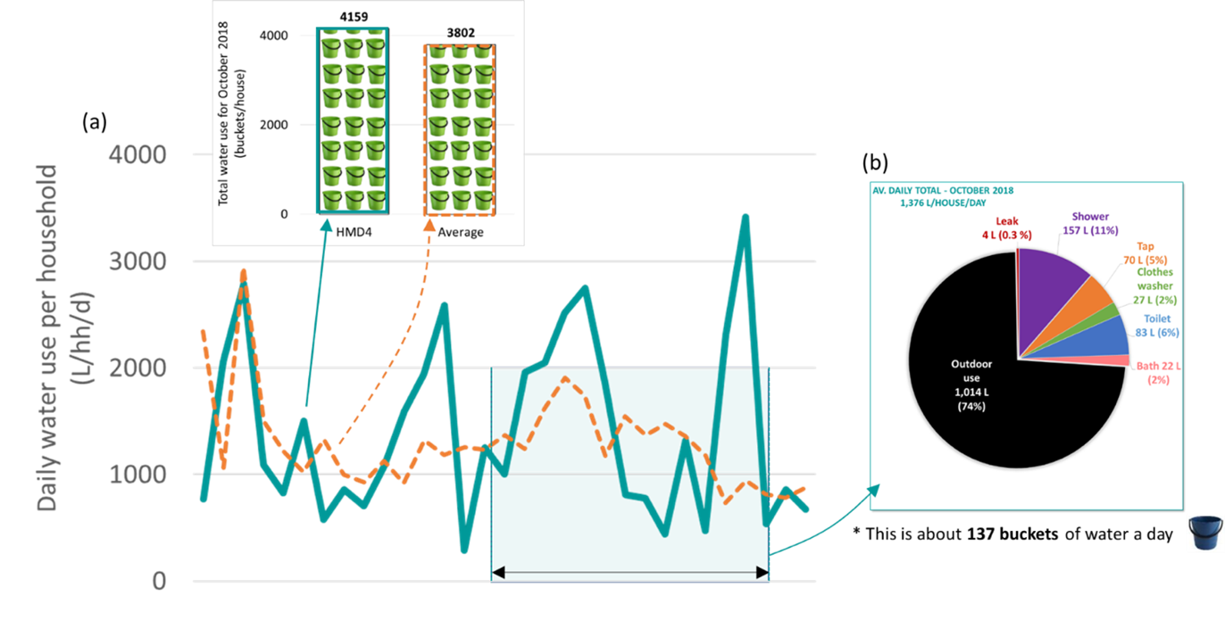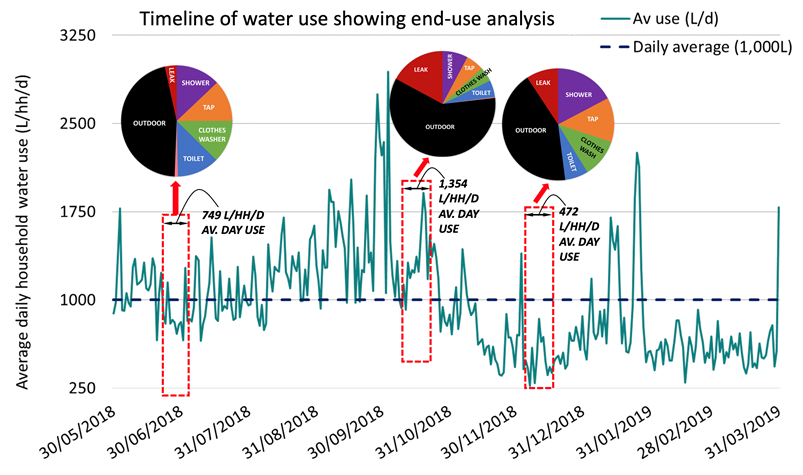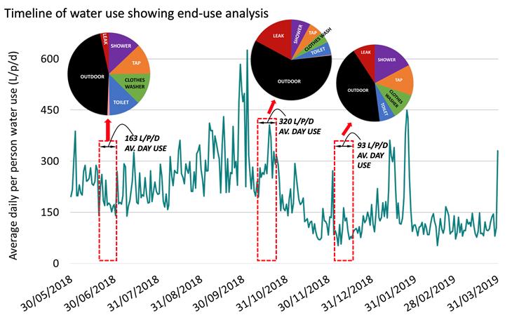 The end-use pie charts show outdoor use (black wedges) remains a ‘hotspot’ area for targeted demand management. This has been demonstrated previously (Beal et al 2019, 2018). Indoor water use remained relatively homogenous across time with large leak events (red wedges) at two homes influencing the total end-use trends in October (this leak was not prolonged).