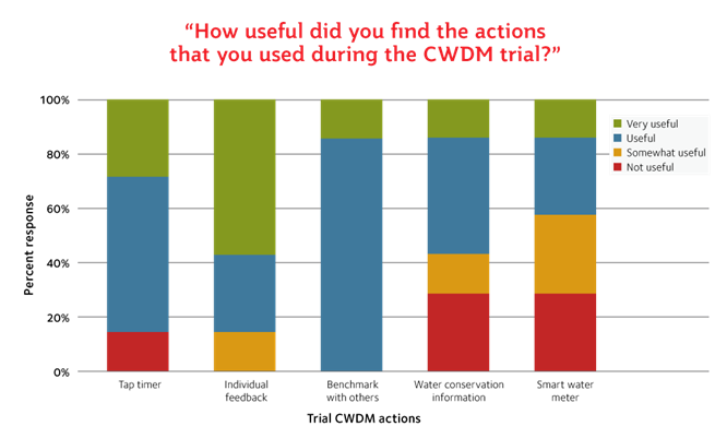 In reality, a successful CWDM approach does not rely on only one or two tools or strategies, but delivers a suite of actions. These could include council directed ones, such as water restrictions and council feedback to households on their water use, and community-led ones, such as using tap timers, checking leaks, and generally committing to using water more efficiently. The CWDM trial highlights how different approaches can positively impact on water use with a 42% reduction in water use from participating households being recorded.