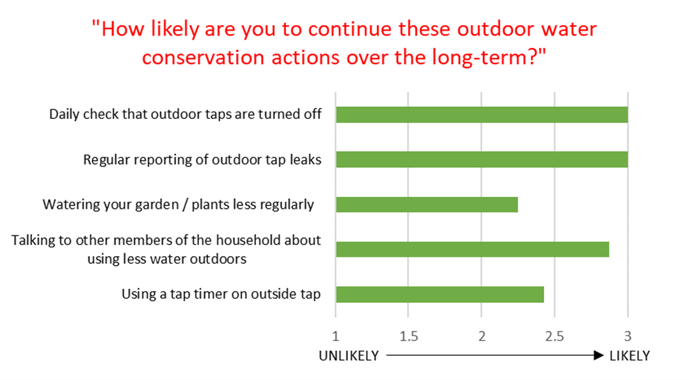 In general, participants identified a greater likelihood of long-term engagement with outdoor-based water conservation actions relating to communication and engagement rather than physically using less water or using a water-saving device (Figure 9). Others have found that less focus on devices and more emphasis on education stories and two-way communication to be more effective for demand management (Buergelt et al. 2017).