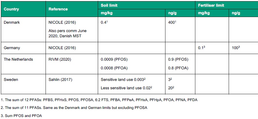 Internet searches did not reveal any other European countries where PFAS limits relating to biosolids or land application were set or a specific strategy was in use, even in countries with well documented approaches to managing PFAS in groundwater, or where PFAS contamination has been extensive.