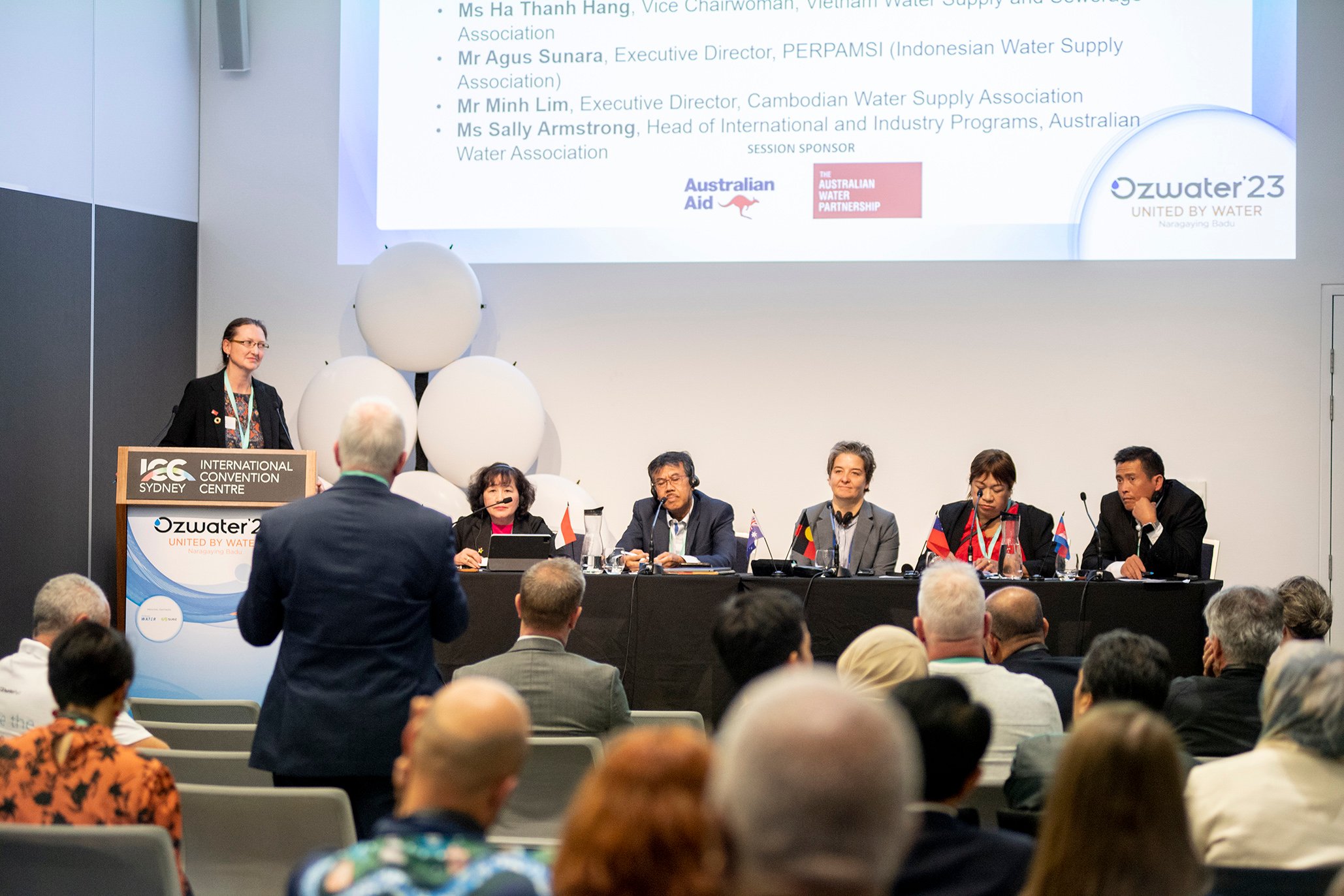 Leaders of AWA partner associations VWSA, PERPAMSI, PWWA, and the Cambodian Water and Wastewater Association (CWA) participating in a panel at Ozwater’23 on the importance of partnerships to build climate resilience, facilitated by Katharine Cross, Strategy and Partnerships Lead at AWP, with Sally Armstrong, Head of International and Industry Programs at AWA.