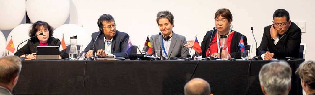 Senior leadership of VWSA, PERPAMSI, AWA, PWWA, and the Cambodian Water and Wastewater Association (CWA) discussing the importance of international partnerships for climate resilience in the water sector on a dedicated panel at Ozwater’23 in Sydney.