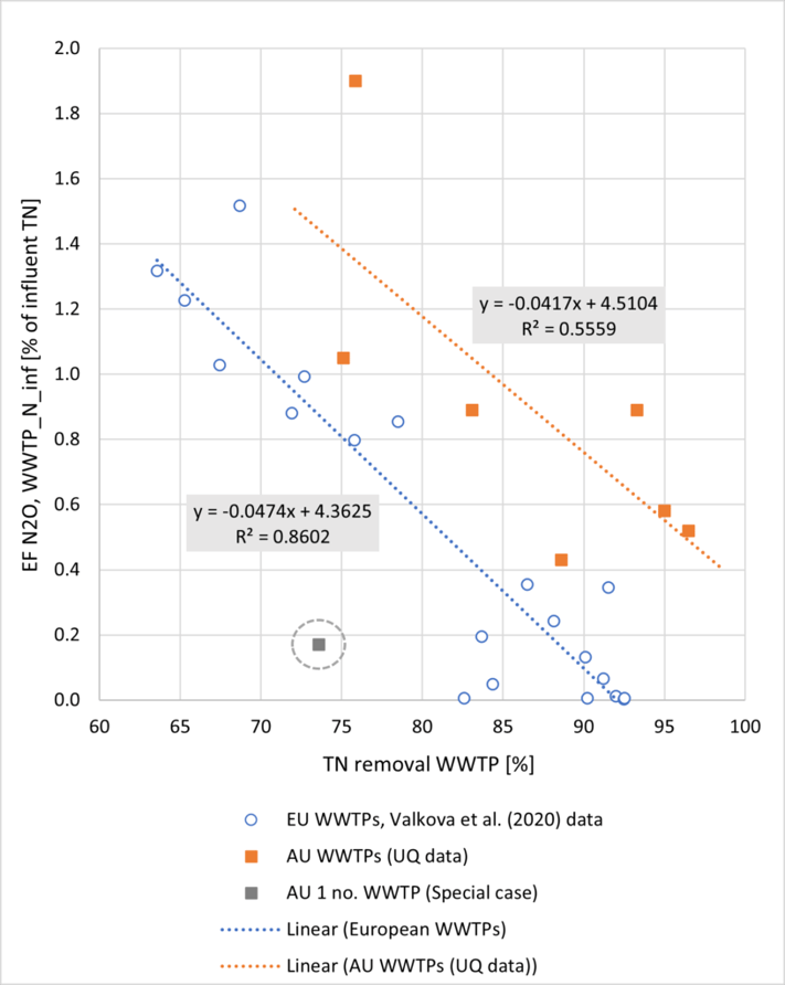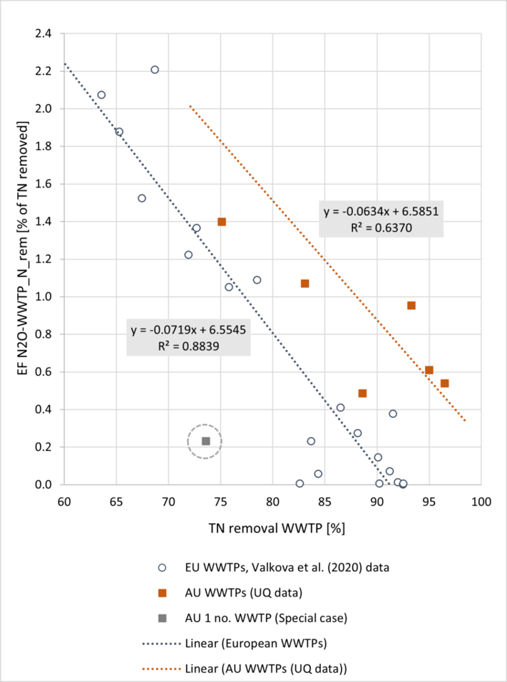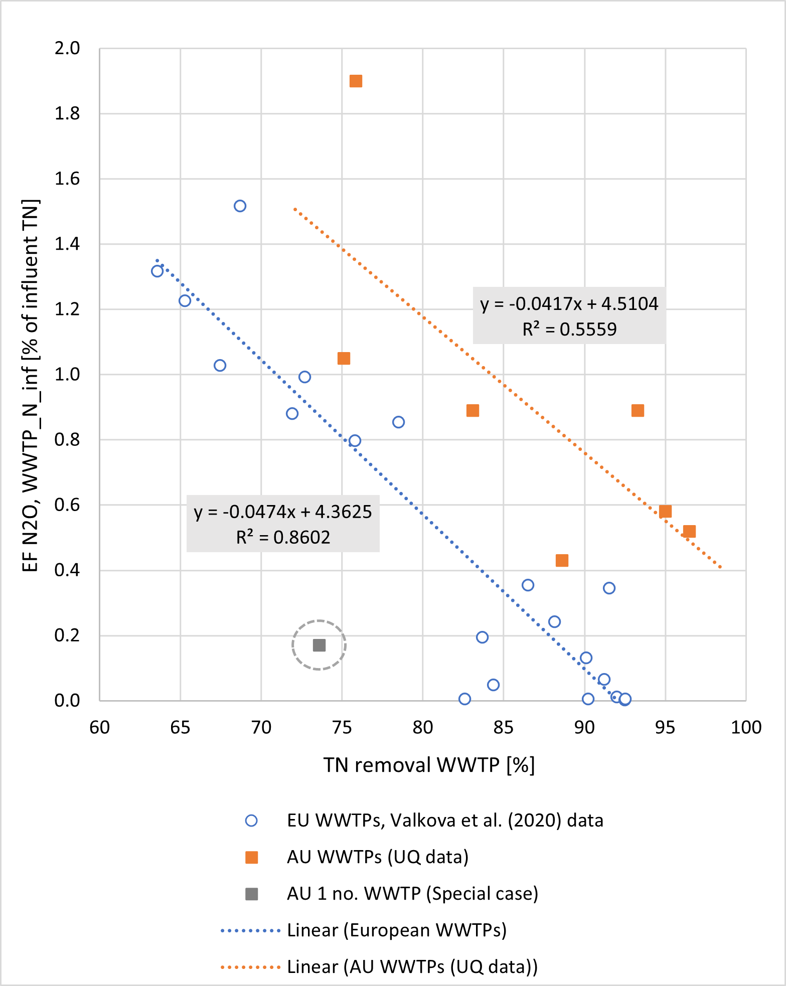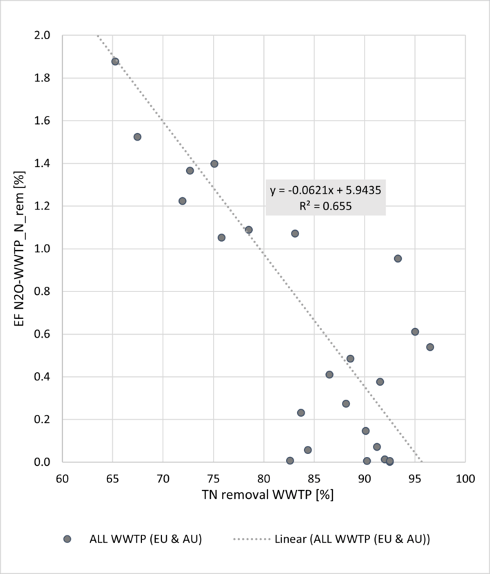Figure 2 shows that both the EU and AU datasets suggest linear trends in plant-wide EFN2O-WWTP where the EF is inversely related to TN removal (expressed in percentage terms) across the WWTP. The linear regression correlation is stronger for the EU dataset (R2 =0.86), which included more datapoints (n = 20), compared with the AU dataset (R2 =0.56, n= 7). One AU WWTP was excluded from the regression analysis since this measurement campaign was a special case (see Figure 2). The measured emissions were relatively low for this plant (considering its configuration and extent of TN removal, compared with other similar plants). Possible reasons for this were related to methodological differences around the off-gas measurement, and the presence of a thick scum/ foam layer on the surface of the aeration tanks in the vicinity of the gas hoods for off-gas collection. Biological removal of N2O through heterotrophic denitrification in the scum/ foam layer is possible.