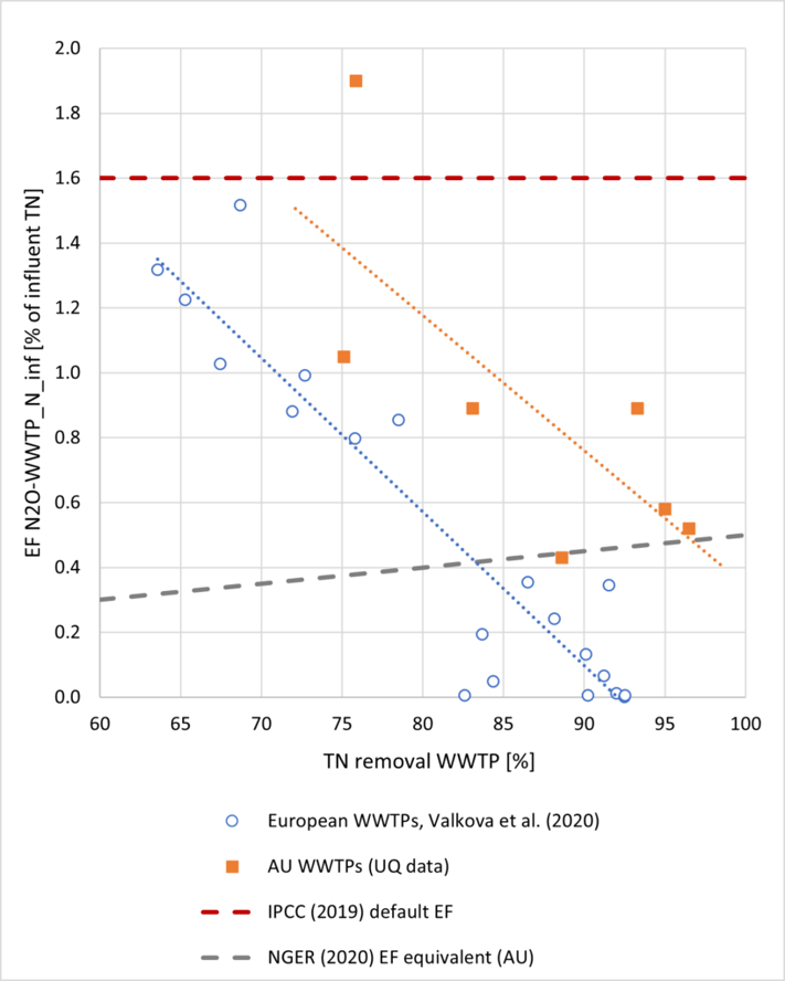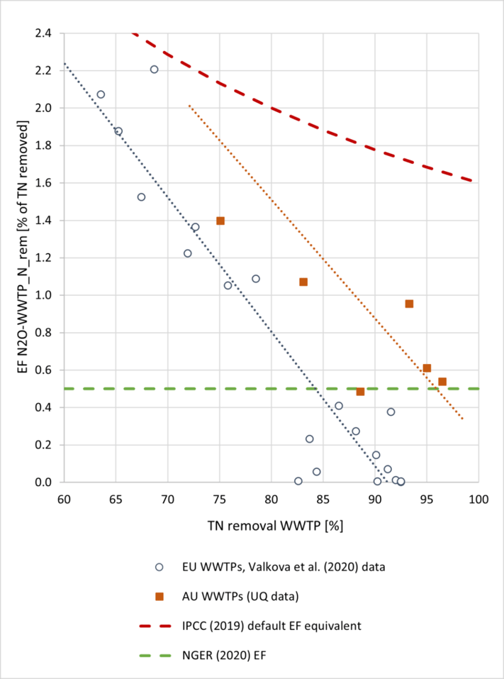 To compare reporting methodologies, the N2O EFWWTP can be expressed in two ways: (1) relative to influent TN load (e.g., IPCC, 2019); or (2) relative to TN removed (e.g., NGER, Australian Govt., 2020). Both approaches were examined for the datasets considered in this study.