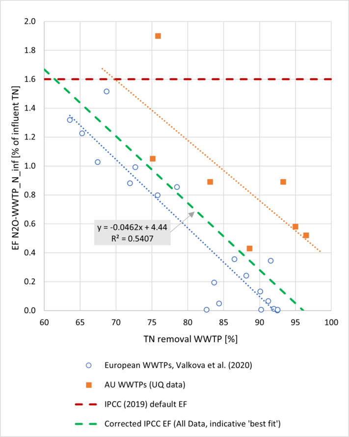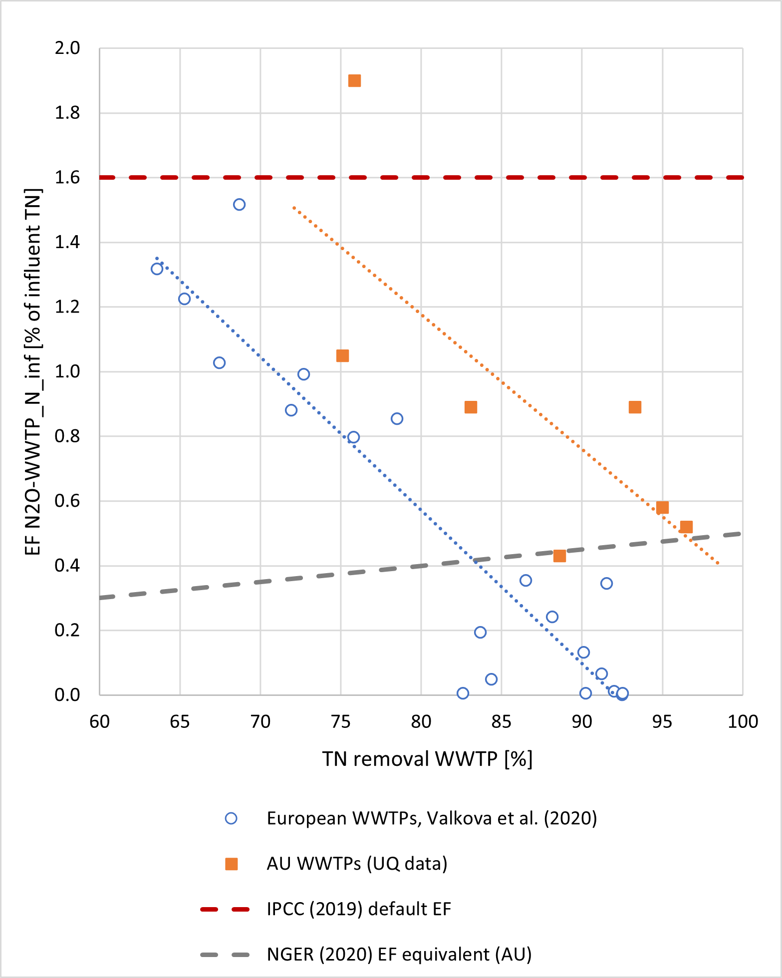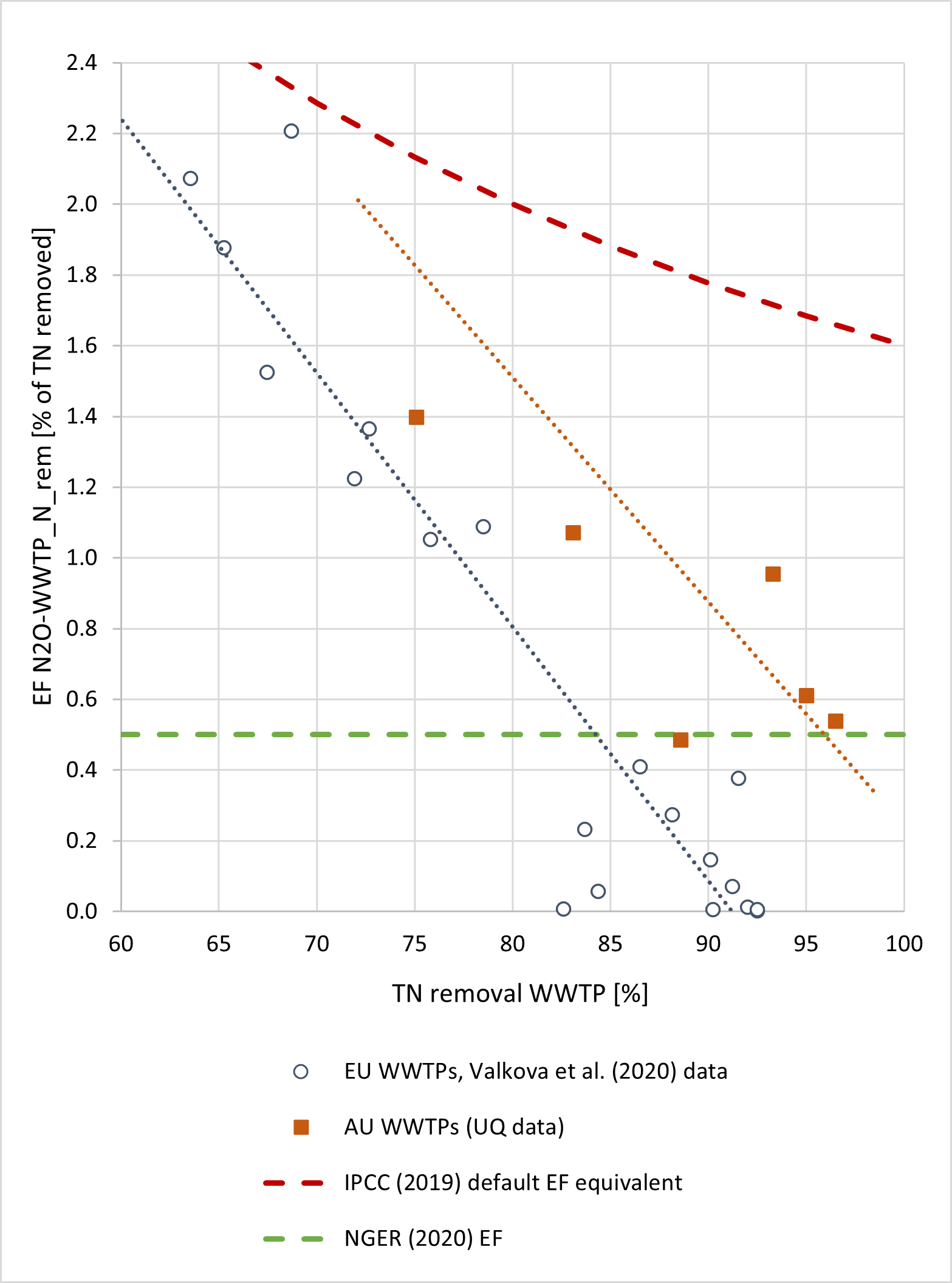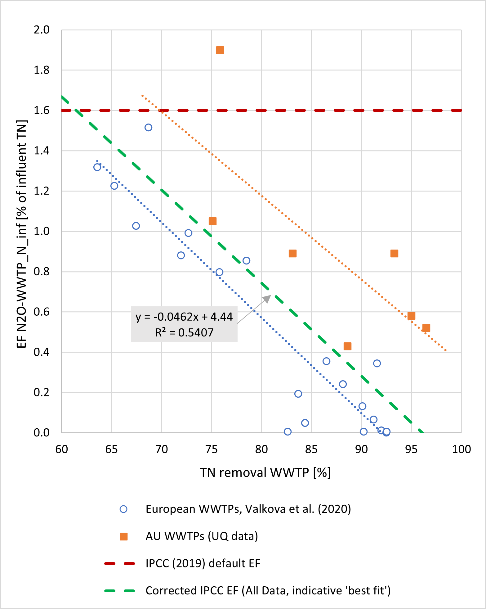 In respect of N2O for domestic wastewater treated in centralised ‘aerobic’ treatment plants (not including effluent discharge), the IPCC guidelines (IPCC, 2019) apply a plant-wide fixed (default) emission factor (EFN2O-WWTP) of 0.016 kg N2O-N/kg N (1.6%) with respect to the influent (raw wastewater) total nitrogen (TN) load - N2O emissions are noted as ‘variable’ with a wide possible EF range given (0.016% - 4.5%) (IPCC, 2019). The IPCC default EFN2O-WWTP does not change with TN removal across the WWTP.