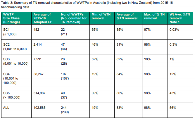 Finally, for context, 2015-16 TN removal data from a benchmarking study of WWTPs in Australia and New Zealand (de Haas et al., 2018) is summarised in Table 3. There is a wide variation in the range of actual TN removal for the WWTPs surveyed in this benchmarking study. Adopting the simple average of TN removal (83%) of all the WWTP surveyed (in 2015-16) might suggest that the NGER default factor is appropriate. However, using a weighted average of 56%TN removal (from Table 3 weighted on plant size i.e., EP, and hence mass of TN treated), by extrapolation from Figure 7, at national scale the NGER default factor is potentially under-estimating N2O emissions by a factor of more than four-fold. This could be corrected by adopting a variable emission factor for N2O reporting, based on TN removed for each plant, as suggested above.
