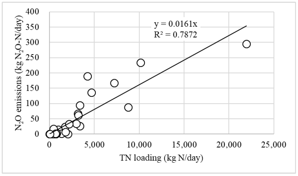 Since the predominant mechanisms for N2O formation in WWTPs involve biological pathways for nitrification and denitrification (Table 1), it is more sensible to relate the N2O emission factor to TN removal than influent TN.