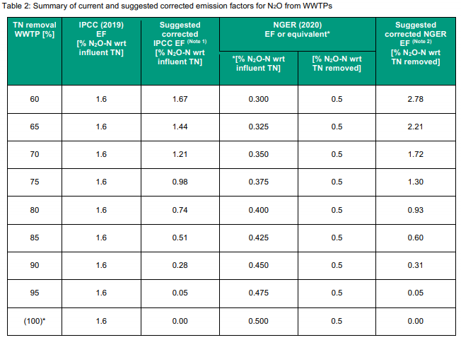 By contrast, for N2O from domestic wastewater treatment, the NGER Determination (Australian Govt., 2020) applies a plant-wide fixed EFN2O-WWTP of 2.082 tonnes CO2-e as N2O per tonne N "produced" (removed), which converts to 0.005 tonnes N2O-N per tonne N removed (0.5% of TN removed) at 265 tonnes CO2-e/ tonne N2O. For a case where treatment removal (by mass balance calculations in the NGER methodology) is indicatively 80% of influent TN, the NGER EF for N2O is equivalent to 0.4% of influent TN (i.e., four times lower than the IPCC default EF, see above). The NGER methodology provides no guidance on the range in the EF for N2O. However, when comparing the IPCC and NGER methods in equivalent terms (i.e., both relative to influent TN), the NGER EF effectively decreases with decreasing TN removal across the WWTP.