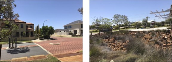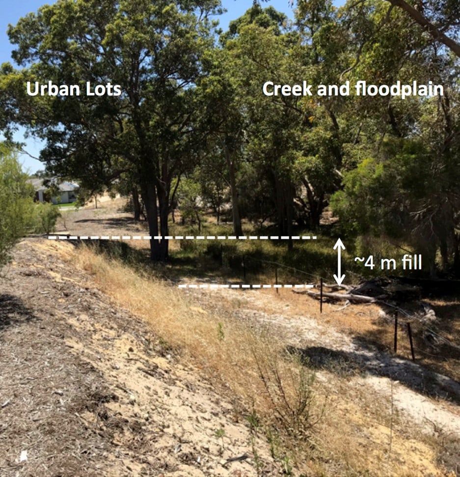 Figure 1: Illustration of extensive use of fill in a new urban development in Perth's North-Eastern Corridor. Abutting a creek, its floodplain and protected bushland, the developed land surface was elevated by as much as 4m above the natural land surface.