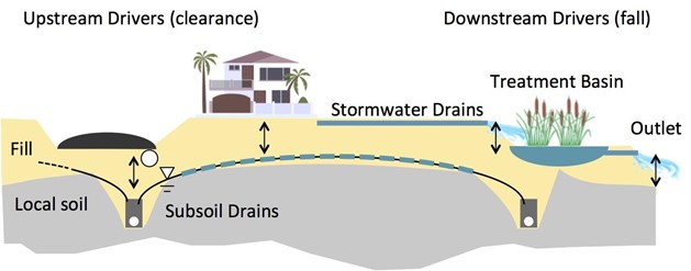 Conservative fill use can be thought of as a response both to “upstream” drivers within the developed lots and “downstream” drivers associated with water leaving these lots (Figure 2). Upstream drivers relate to allowing appropriate clearance between the phreatic surface of the groundwater and overlying urban infrastructure. Infrastructure includes roads, utility/pipe corridors, housing foundations and other “hard” components of the urban landscape that can be damaged by groundwater or by wetting/drying of underlying soil. These include vegetated areas, such as backyards or public open space, which do not fulfil their purpose if they are muddy, waterlogged, or form breeding sites for pests. Failing to keep these areas dry is a high-visibility and high-cost problem.