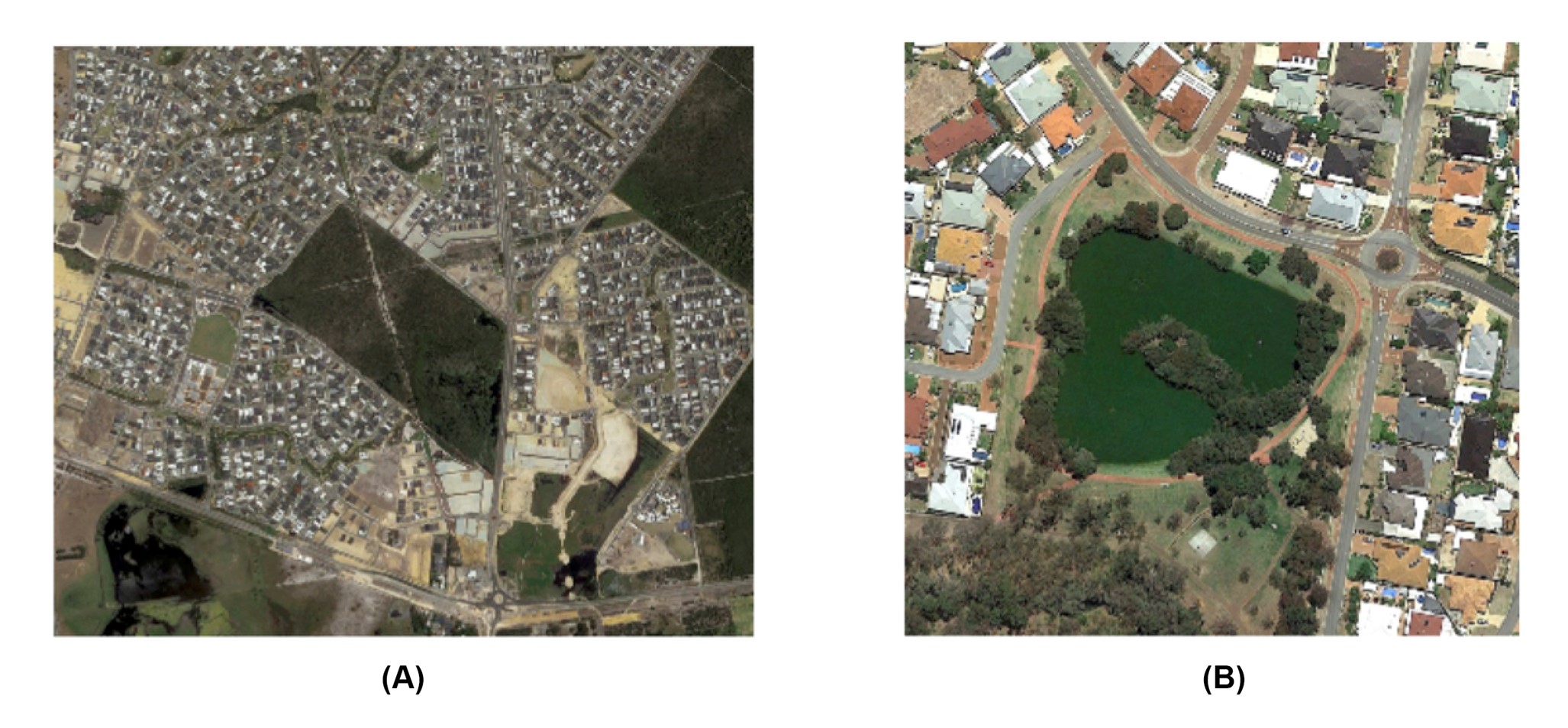 Figure 4: (A) An area in Perth surrounded by multiple urban developments, many of which used fill to elevate the land surface. (B) A lake in the greater Perth metropolitan region showing a green algal bloom. Eutrophication in the lake is primarily driven by groundwater inflows, and became problematic approximately 15-20 years following urbanisation of the surrounding area.