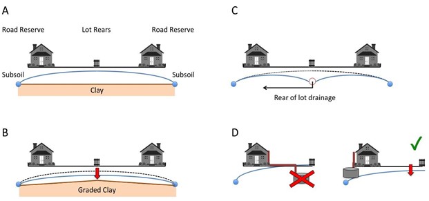 Figure 5: (A) Schematic of a groundwater mound forming at the rear of two urban lots. (B) Following grading of the clay downslope to the subsoil drains, the hydraulic gradient is increased and the peak groundwater level drops. (C) Installation of rear-of-lot-drainage would drain the mound, and (D) Installing soakwells near the subsoil drain (front of lot) rather than near the groundwater mound (rear of lot) promotes drainage and avoids exacerbating rear-of-lot flooding.