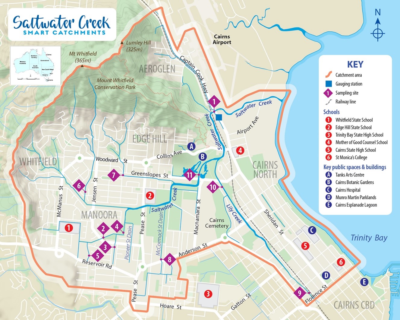 Saltwater Creek is a developed urban catchment north of the Cairns central business district (Figure 1). The catchment is approximately 16.4 km2 with a relatively flat topography and headwaters in the Whitfield Range. One characteristic that makes this catchment difficult to study is the extent of estuarine influence upstream into the catchment.