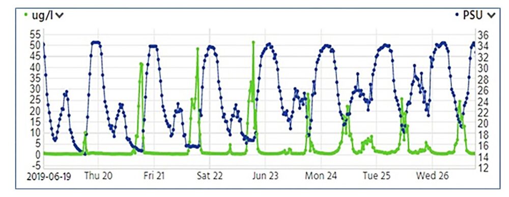 Figure 4: Chlorophyll-a concentrations (green line, left-hand axis) during an algal bloom on Saltwater Creek. Blue line is salinity (right-hand axis)