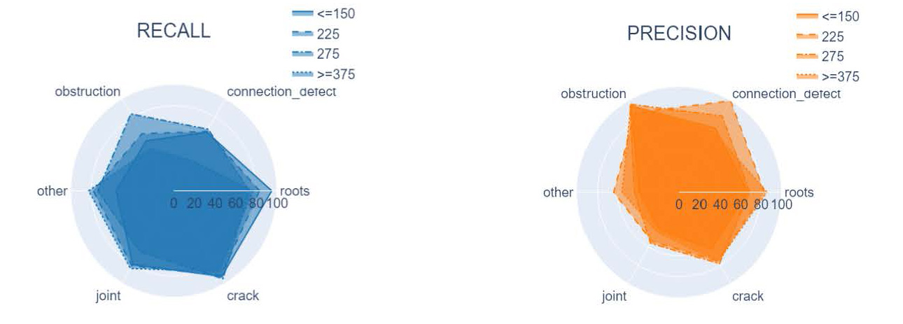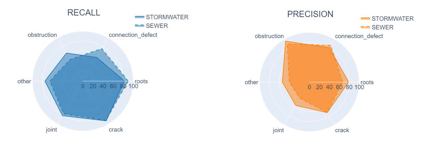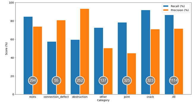The VAPAR algorithm only missed 7.8% of the cracks (recall of 92.2%) and had a relatively high precision (71.3%). This high performance originates from the fact that cracks are one of the most common defects in sewer and stormwater pipes; large datasets were therefore available to calibrate the VAPAR algorithm for this type of defect.