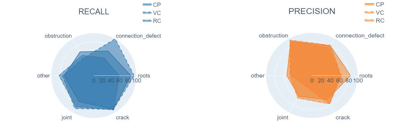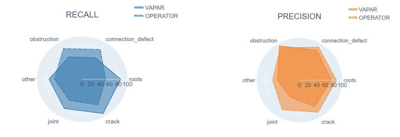 From this study, the operator had higher recall for connection and obstruction defects, with similar precision. However, for roots, cracks and joint displacement, VAPAR had greater recall but lower precision.