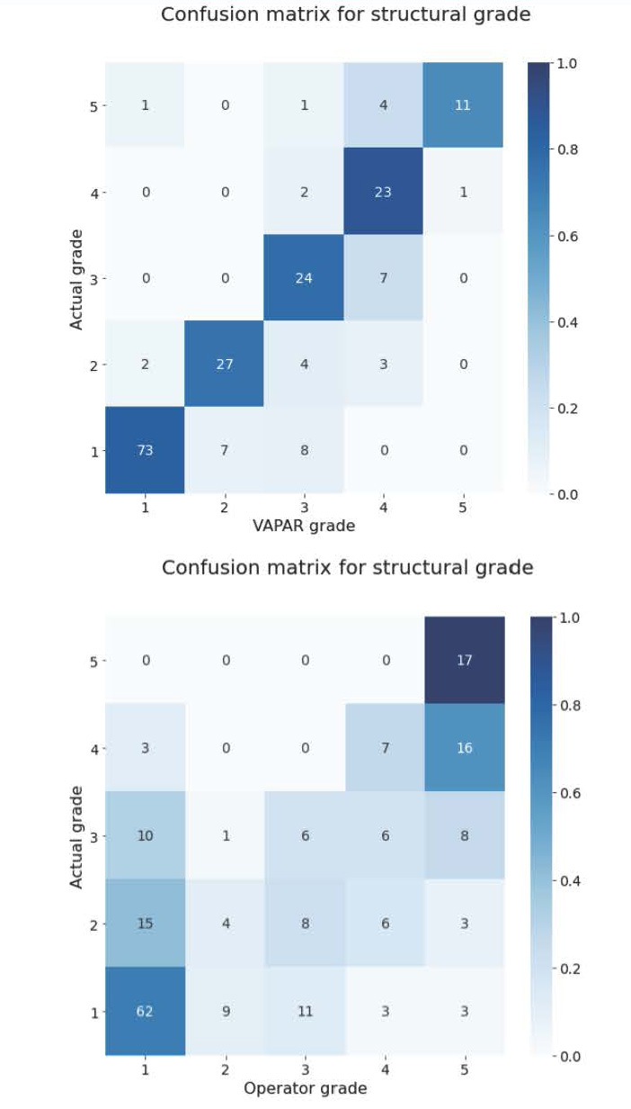 Figure 14 shows that the VAPAR analysis is significantly more accurate than the operator when assessing the structural grades of pipes. VAPAR correctly estimated the structural grade of pipes for 79.8% of inspected pipes and was within a grade of +/-1 around the actual grade for 93.4% of the pipes.