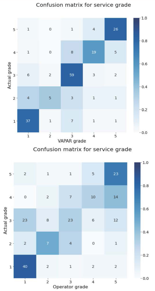Figure 15 shows that the VAPAR algorithm was also relatively more accurate than operators to estimate the service grade, with a total of 151 videos with a correct service grade of 76.3%, and 88.9% of grades within +/-1 around the actual service grade (against 52.2% and 76.3% for the operator, respectively).