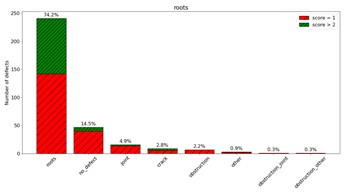 The relatively high recall (84.8%) and precision (74.2%) for roots show that this type of defect can be easily identified by the VAPAR algorithm. Figure 4 shows that 14.5% of the defects identified by VAPAR were not actual defects, and that most of these defects had a score of 1, i.e. defects that were identified as micro-defects.