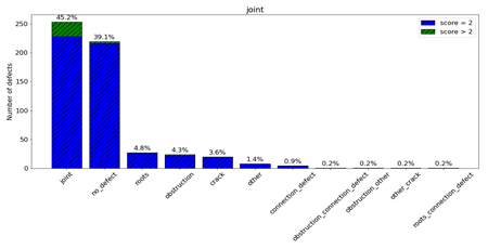 Figure 7: Repartition of the defects identified by VAPAR as ‘joint defects’.45.2% of these defects were indeed joint defects; 39.1% were not defects, etc. The colour represents the fraction of micro defects (blue; score of 2) and bigger defects (green, score higher than 2).